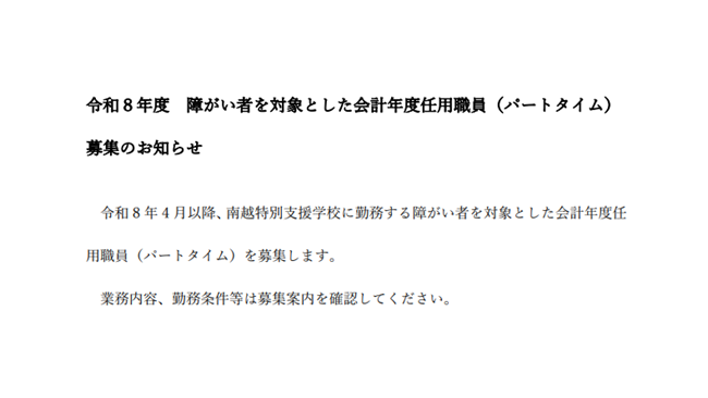 投稿日: 2026年2月15日2026年2月16日 投稿者: 管理人※令和8年度 障がい者を対象とした会計年度任用職員(パートタイム)募集のお知らせ※ ・募集案内 (pdf) ・採用試験申込書 (pdf) (Excel)